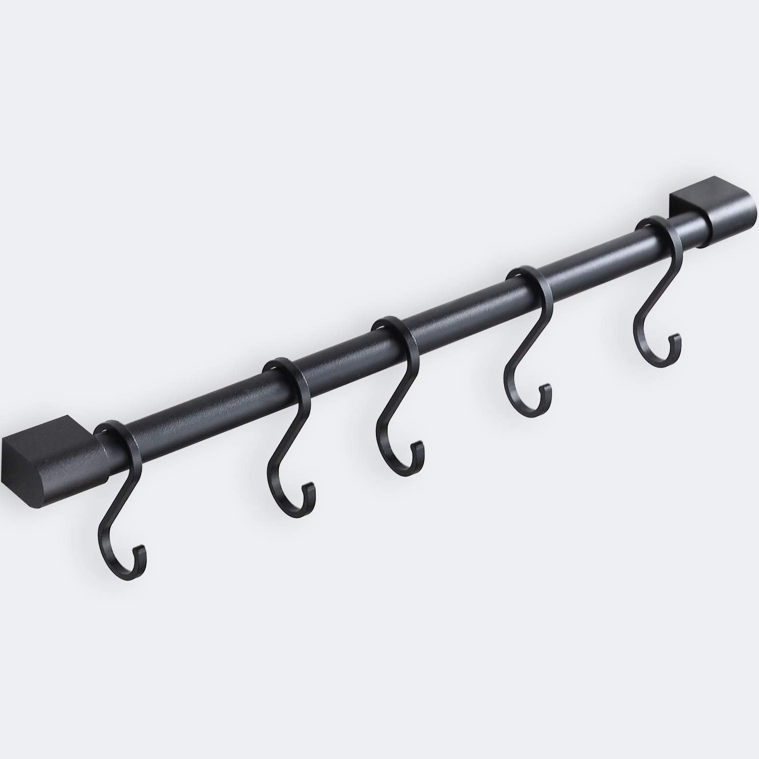 - ✔【PRODUCT DIMENSION】: The 17.3” x 1.3” x 1” (44*3.2*2.5cm) kitchen rail comes with 5 S-hooks. These wall mounted rack can hold 20kg(44lb) at most, strong enough to hold cups, cooking utensil set, tongs and other items.